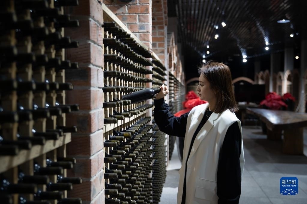 5月19日,在越橘莊園酒窖內(nèi),工作人員在檢查藍莓酒儲藏情況。