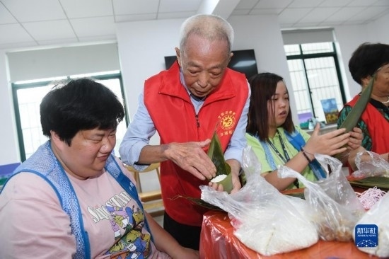 5月29日,在湖州市環(huán)渚街道玉堂橋社區(qū)組織的迎端午活動(dòng)中,凌法林(左二)和其他志愿者一起指導(dǎo)殘障人士包粽子。