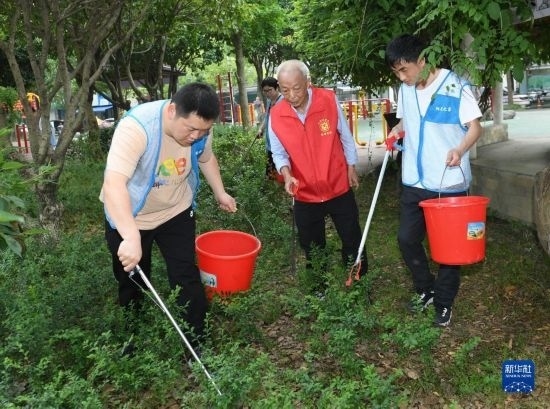 5月29日,在湖州市環(huán)渚街道玉堂橋社區(qū),凌法林(中)帶領(lǐng)殘障人士參與到社區(qū)日常保潔工作中。