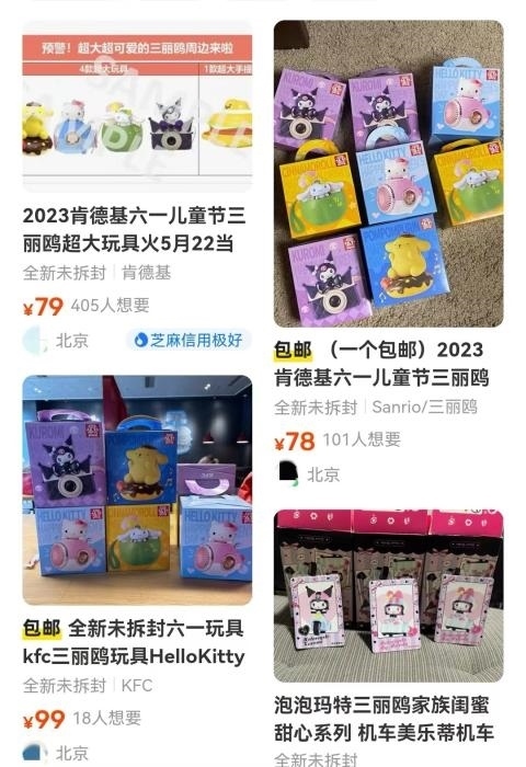 在某二手平臺,肯德基此次發(fā)售的三麗鷗玩具,標價集中在70元至100元之間,比69.9元的兒童節(jié)套餐價格更貴。麥當勞俄羅斯方塊游戲機的價格多在40元至60元之間。