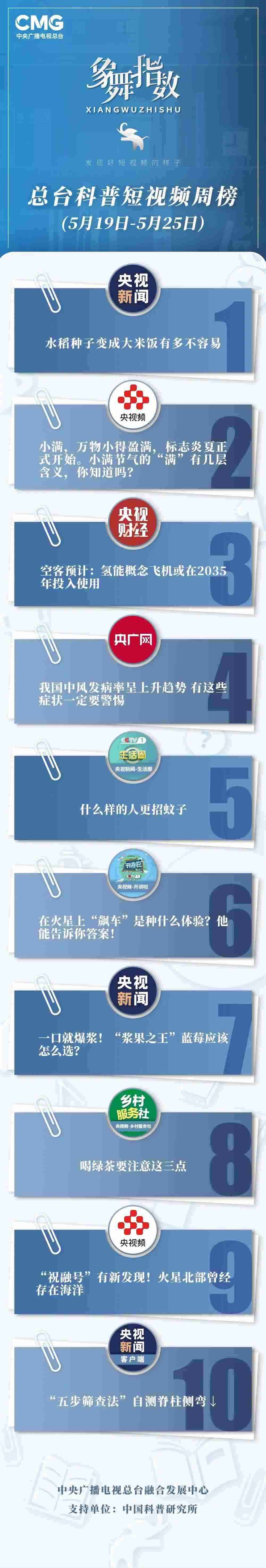 中央廣播電視總臺“象舞指數(shù)”評議品牌,推出科普短視頻周榜、總臺科普短視頻周榜。在2023年5月19日-5月25日,值得注目的內(nèi)容有: