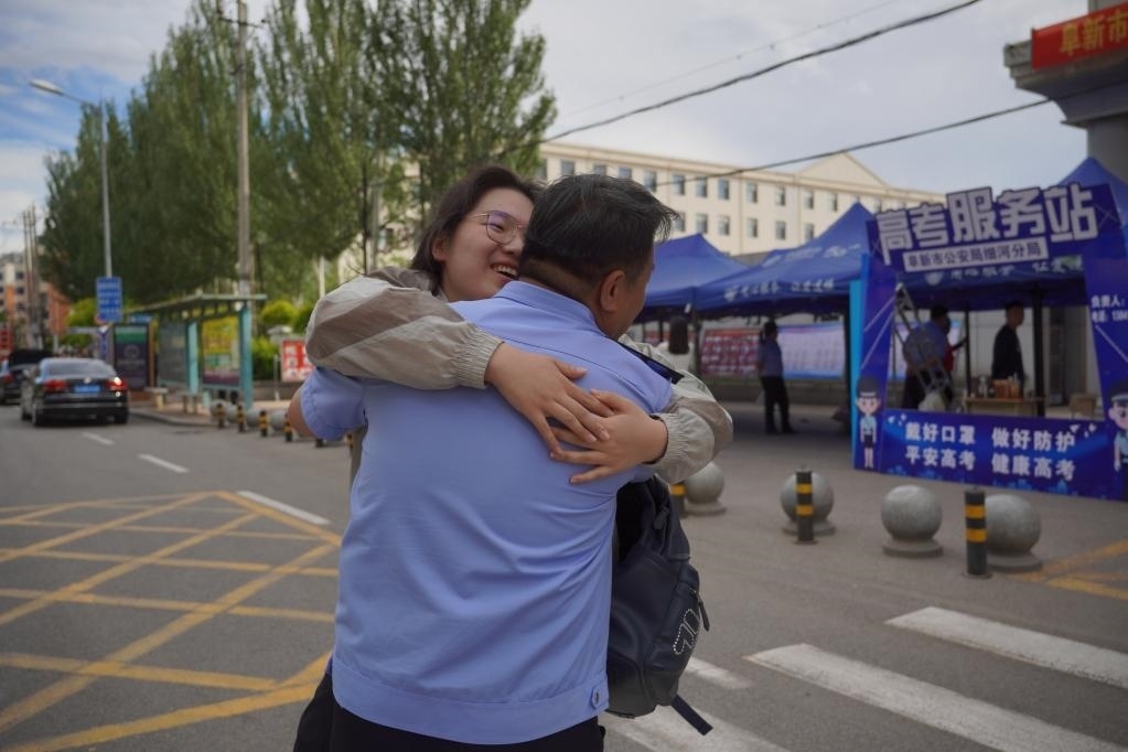 6月9日,在遼寧省阜新市海州高級中學(xué)考點(diǎn),考生邢雨桐與身為考點(diǎn)執(zhí)勤民警的父親熱情相擁。新華社記者王瑩 攝