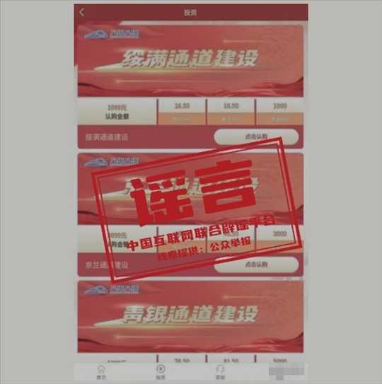 真相:近期,中國國家鐵路集團有限公司接到群眾來電咨詢,反映一款名為“八縱八橫”APP程序自稱是國鐵集團授權推出的理財產品,設有“呼南通道建設”“沿海通道建設”“京蘭通道建設”等9款投資理財項目,并將國鐵集團公司簡介、新聞報道等內容在APP中用于宣傳推廣。對此,國鐵集團發(fā)布嚴正聲明稱,國鐵集團及所屬單位從未授權或利用其他網站、APP、微信公眾號、微博等形式以“國鐵集團”或“中國鐵路”的名義銷售投資理財產品,也沒有通過這樣的方式籌集鐵路建設資金。不法分子利用“八縱八橫”APP程序所實施的行為和發(fā)布的內容已涉嫌詐騙,請公眾提高警惕,謹慎區(qū)分,注意防騙。如已被騙,請立即向公安機關報案。(來源:“中國鐵路”微信公眾號)