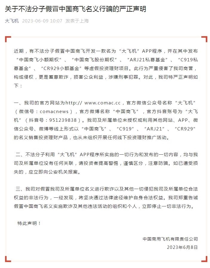 另據(jù)“大飛機(jī)”微信公眾號(hào)6月9日發(fā)布的《關(guān)于不法分子假冒中國商飛名義行騙的嚴(yán)正聲明》,有不法分子假冒中國商飛開發(fā)一款名為“大飛機(jī)”APP程序,并在其中發(fā)布“中國商飛小額期權(quán)”、“中國商飛股份期權(quán)”、“ARJ21私募基金”、“C919私募基金”、“CR929小額基金”等虛假投資理財(cái)項(xiàng)目。