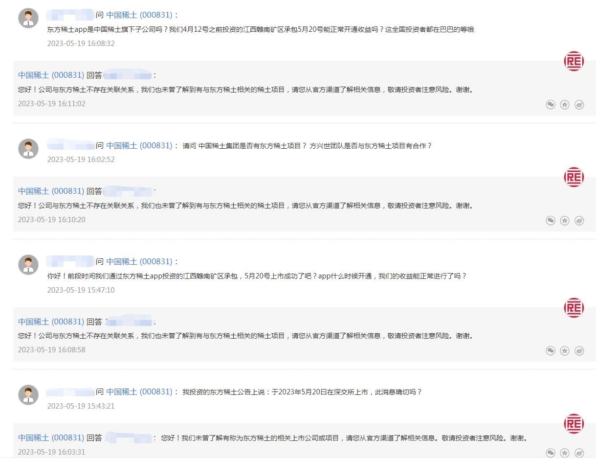 中新財(cái)經(jīng)注意到,有投資者曾在互動(dòng)平臺(tái)上向中國稀土詢問“東方稀土”相關(guān)信息,從提問內(nèi)容看,可能已有投資者被誤導(dǎo)受騙。比如,“東方稀土APP是中國稀土旗下子公司嗎?我們4月12號(hào)之前投資的江西贛南礦區(qū)承包5月20號(hào)能正常開通收益嗎?”“我投資的東方稀土公告上說:于2023年5月20曰在深交所上市,此消息確切嗎?”等等。