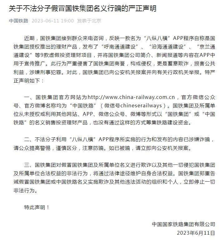 “中國鐵路”微信公眾號(hào)6月11日發(fā)布嚴(yán)正聲明稱,近期,國鐵集團(tuán)接到群眾來電咨詢,反映一款名為“八縱八橫”APP程序自稱是國鐵集團(tuán)授權(quán)推出的理財(cái)產(chǎn)品,發(fā)布了“呼南通道建設(shè)”、“沿海通道建設(shè)”、“京蘭通道建設(shè)”等9款虛假投資理財(cái)項(xiàng)目,并將國鐵集團(tuán)公司簡介、新聞報(bào)道等內(nèi)容在APP中用于宣傳推廣。