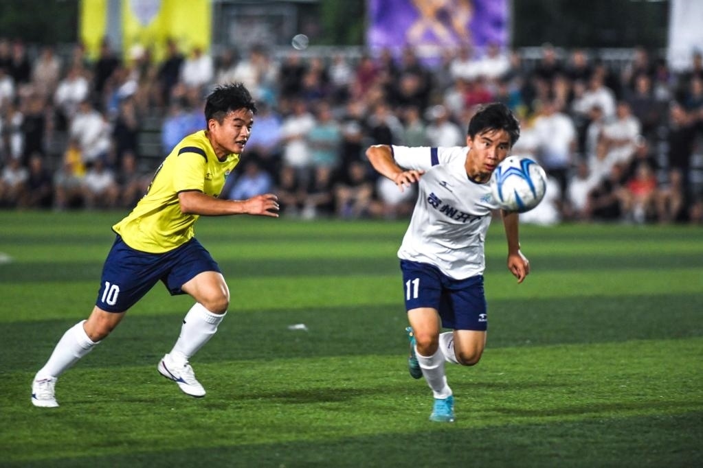 6月9日,貴州開放大學(xué)足球隊球員與榕江足球代表隊球員(左)在友誼賽中拼搶。新華社記者 楊文斌 攝