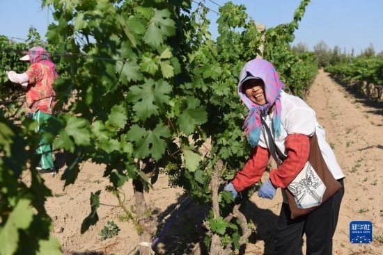 6月21日,在河北省懷來縣長城桑干酒莊葡萄種植基地,當?shù)剞r民在田間勞作。