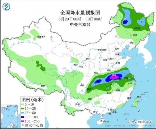 圖4 全國(guó)降水量預(yù)報(bào)圖(6月29日08時(shí)-30日08時(shí)) 圖自中央氣象臺(tái)網(wǎng)站