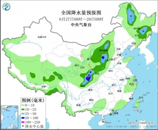6月27日08時(shí)至28日08時(shí),甘肅東南部、陜西、四川盆地、內(nèi)蒙古中部和東北部、山西西部、黑龍江西部和東南部、吉林東北部、廣東東南部等地部分地區(qū)有中到大雨,其中,山西西部、陜西西南部、四川盆地北部等地部分地區(qū)有暴雨或大暴雨(100~110毫米)。西北地區(qū)東部、華北、江南東部、西藏南部等地部分地區(qū)有4~6級(jí)風(fēng),其中,內(nèi)蒙古西北部部分地區(qū)有6~7級(jí)風(fēng)(見圖2)。
