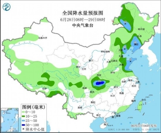 6月28日08時(shí)至29日08時(shí),內(nèi)蒙古東部、吉林西南部、遼寧大部、河北西部、天津東部、山東、黃淮東部、陜西南部、四川盆地、重慶、湖北西部等地部分地區(qū)有中到大雨,其中,湖北西部、四川盆地東北部、重慶東北部等地部分地區(qū)有暴雨(50~80毫米)。內(nèi)蒙古東北部部分地區(qū)有4~5級(jí)風(fēng)(見圖3)。