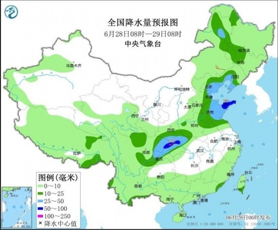 6月28日08時(shí)至29日08時(shí),內(nèi)蒙古東北部、東北地區(qū)西部、遼東半島、西北地區(qū)東南部、華北中東部、黃淮東部、江漢西部、川西高原北部、西南地區(qū)東部等地部分地區(qū)有中到大雨,其中,山東半島、湖北西部、四川盆地東北部、重慶北部等地部分地區(qū)有暴雨或大暴雨(100~140毫米)。內(nèi)蒙古東南部部分地區(qū)有4~5級風(fēng)(見圖3)。