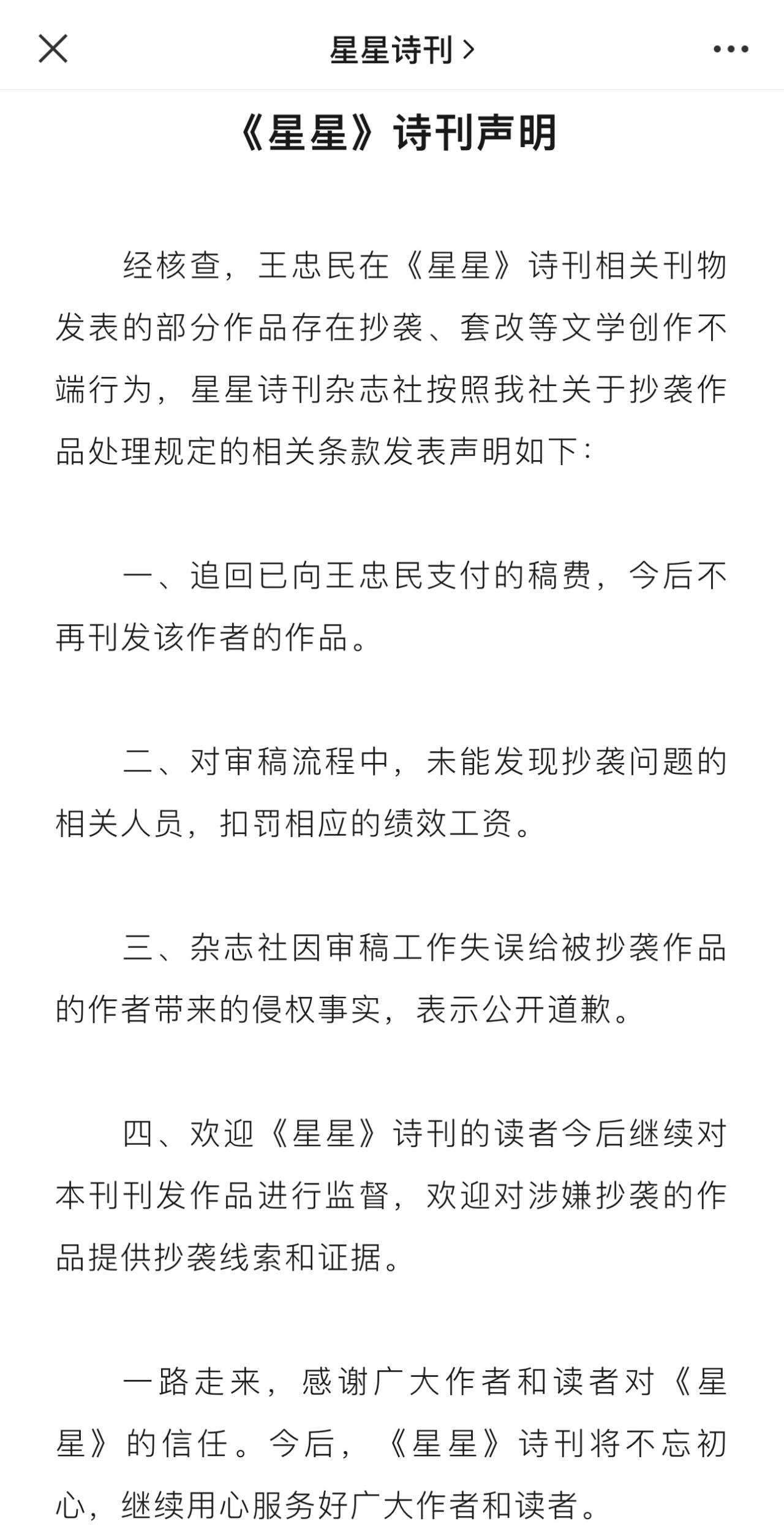 《星星》詩(shī)刊雜志社稱(chēng),按照該社關(guān)于抄襲作品處理規(guī)定的相關(guān)條款,追回已向王忠民支付的稿費(fèi),今后不再刊發(fā)該作者的作品;對(duì)審稿流程中,未能發(fā)現(xiàn)抄襲問(wèn)題的相關(guān)人員,扣罰相應(yīng)的績(jī)效工資。