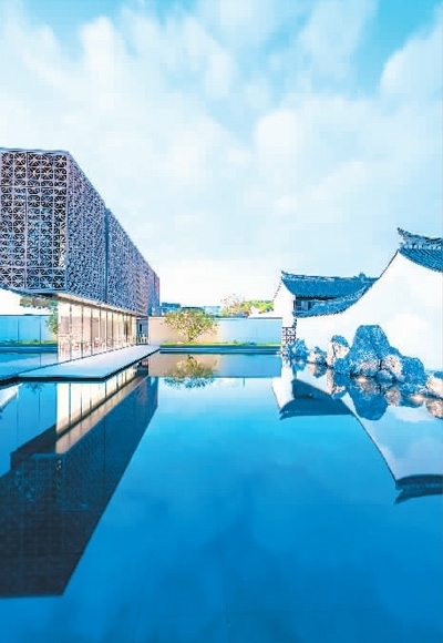 圖書館前立著一面照壁,壁上刻有蔡元培題詩,表達對故鄉(xiāng)的眷戀。繞過照壁,一片方形水景映入眼簾,水中點綴山石,水畔一側是蔡元培故居外墻,另一側是一排鏡面,白墻黛瓦、流云片石映照在水面、鏡中,美不勝收。