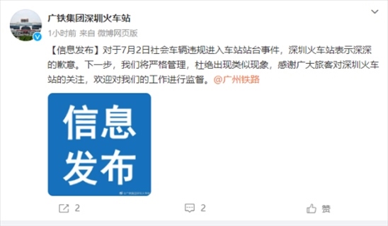 ·深圳火車站就私家車上站臺致歉:將嚴(yán)格管理,杜絕出現(xiàn)類似現(xiàn)象。