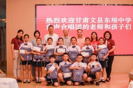 7月4日中午,在中國(guó)記協(xié)會(huì)客廳,文縣東壩童聲合唱團(tuán)的孩子們見(jiàn)到了他們熟悉的中國(guó)記協(xié)黨組書(shū)記、副主席劉思揚(yáng)爺爺。今年2月,劉思揚(yáng)爺爺專(zhuān)門(mén)來(lái)到文縣,走進(jìn)他們的排練廳,聆聽(tīng)了他們即將在甘肅廣播電視總臺(tái)演出的曲目。他當(dāng)場(chǎng)說(shuō):“我被孩子們眼中的光深深地觸動(dòng)了。這是一種自信的、堅(jiān)毅的光。帶著這種光,無(wú)論你們將來(lái)走出大山,還是學(xué)成后回到山里建設(shè)家鄉(xiāng),這種自信和堅(jiān)毅的情愫都將伴隨你們終生?!苯裉旌⒆觽兌汲闪藙⑺紦P(yáng)爺爺?shù)男】腿恕敔斀o孩子們講述了什么是記者、什么是記協(xié),鼓勵(lì)孩子們好好學(xué)習(xí),將來(lái)報(bào)效祖國(guó)。劉爺爺還為每個(gè)孩子準(zhǔn)備了滿(mǎn)滿(mǎn)一個(gè)大書(shū)包的各種禮物。孩子們排著演出隊(duì)形,為中國(guó)記協(xié)的老師們唱出了《大山里的孩子》,還有那首剛剛學(xué)會(huì)的、走進(jìn)央視錄音棚的《童心里的中國(guó)》: