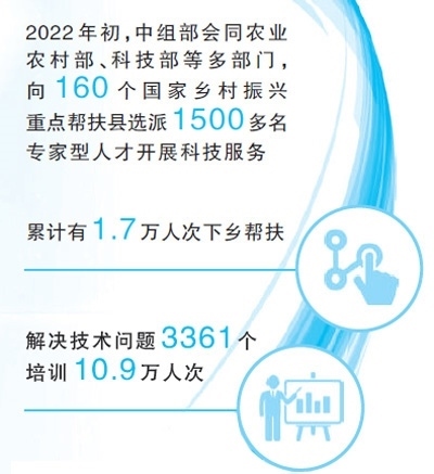 2022年初,中組部會同農(nóng)業(yè)農(nóng)村部、科技部等多部門,以“一縣一團(tuán)”方式,向160個國家鄉(xiāng)村振興重點幫扶縣選派1500多名專家型科技支撐人才,精準(zhǔn)開展科技服務(wù)和人才培養(yǎng)幫帶。