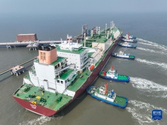 一艘LNG運(yùn)輸船靠泊在唐山港曹妃甸港區(qū)(2023年6月18日攝,無(wú)人機(jī)照片)。新華社發(fā)(趙亮攝)