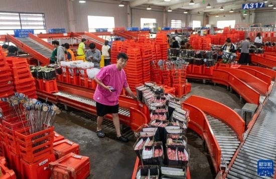 在云天化晉寧花卉產(chǎn)業(yè)現(xiàn)代化示范園內(nèi),花農(nóng)們將預(yù)冷處理后的鮮花放入自動(dòng)分揀流水線(7月12日攝)。新華社記者 崔文 攝