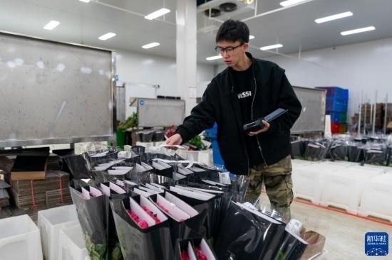 一名工作人員在昆明國(guó)際花卉拍賣交易中心內(nèi)對(duì)臺(tái)車上存放的鮮花進(jìn)行掃碼(7月13日攝)。新華社記者 陳欣波 攝