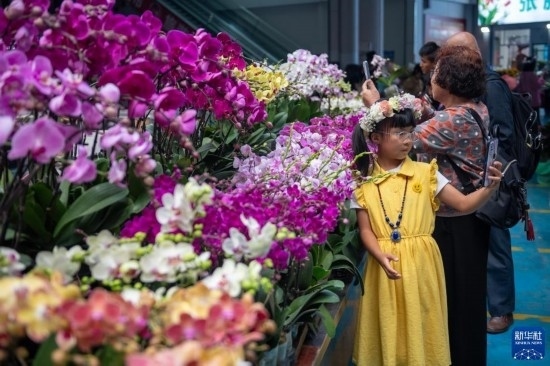 小朋友在昆明斗南花卉市場(chǎng)內(nèi)的鮮花旁自拍(7月13日攝)。新華社記者 陳欣波 攝