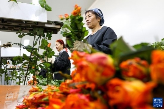 在云天化晉寧花卉產(chǎn)業(yè)現(xiàn)代化示范園內(nèi),花農(nóng)們將鮮切花自動(dòng)分揀流水線上分揀好的鮮花取下,準(zhǔn)備放入包裝流水線(7月12日攝)。新華社記者 陳欣波 攝