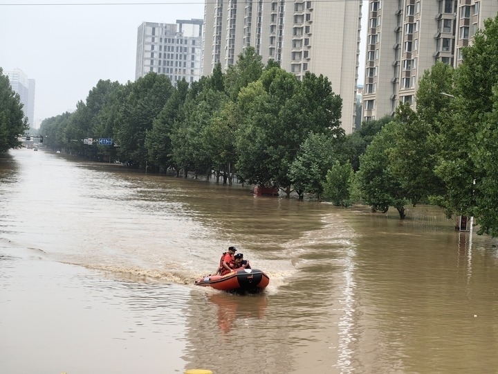8月2日,救援人員在涿州市內(nèi)乘沖鋒舟救援轉(zhuǎn)移群眾。新華社記者 高博 攝
