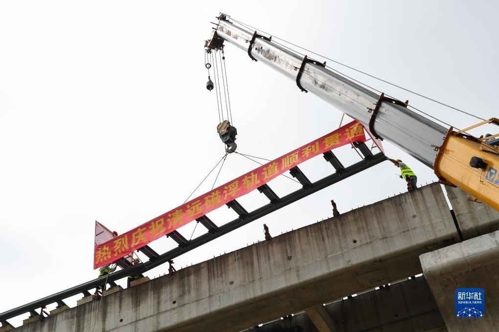 8月10日,廣東清遠(yuǎn)磁浮旅游專(zhuān)線最后一榀軌排被吊裝到橫跨京廣鐵路的長(zhǎng)隆特大橋上。