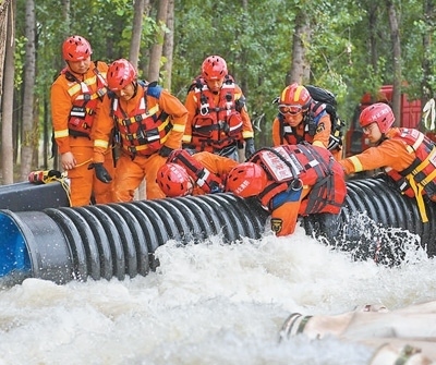 8月6日,在河北省涿州市刁窩鎮(zhèn)東張村,唐山消防救援支隊(duì)隊(duì)員進(jìn)行排澇作業(yè)。新華社記者 牟 宇攝