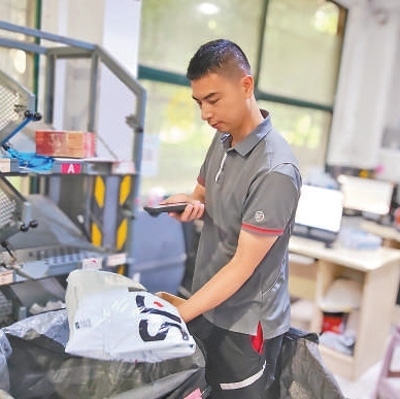 午后,湖北順豐速運(yùn)有限公司武漢唐家墩網(wǎng)點(diǎn),張?jiān):屯聜兪炀毜貙⒋笮〔灰坏目爝f件分類,裝入不同的袋子中。每裝滿一個編織袋,張?jiān)>驮诖谙路劫N上二維碼,再用機(jī)器掃描登記,確認(rèn)無誤后裝車發(fā)運(yùn)。