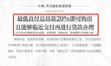 8月26日,紅星資本局向“中糧天悅”售樓部求證此時,一名置業(yè)顧問回復(fù)稱,最近確實(shí)推出了“先交付后還貸”的購房政策,購房者可以先交首付,簽訂購房合同,交房前再辦理貸款即可。