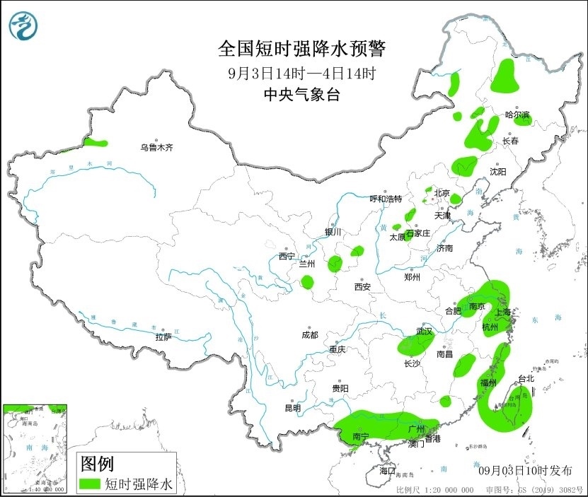預計9月3日14時至4日14時,內蒙古東南部、吉林西部、遼寧西部、山西中部、河北中部和東北部以及福建東部和西北部、廣西南部和東南部沿海、臺灣島等地的部分地區(qū)將有8-10級雷暴大風或冰雹天氣,局地可達11級以上;內蒙古東部、黑龍江西部、吉林西部、遼寧西部、甘肅南部、山西中部、河北西部和東北部、江蘇中南部、安徽東部、上海、浙江北部、福建東部和西北部、廣西南部、廣東西南部、臺灣島等地的部分地區(qū)將有短時強降水天氣,最大小時雨量20-50毫米,局地可達70毫米以上。
