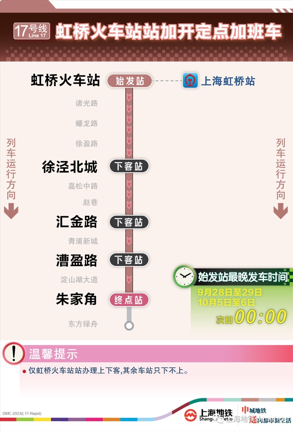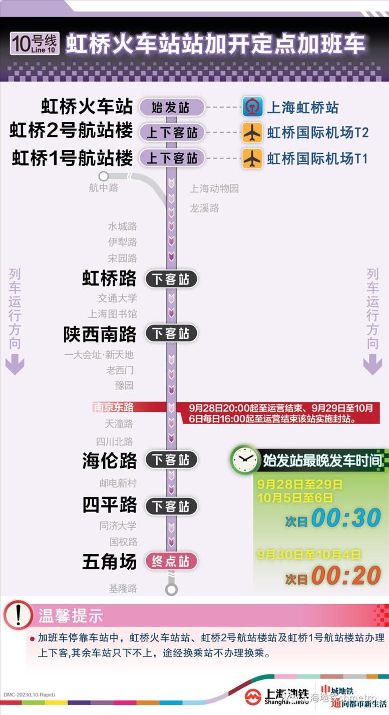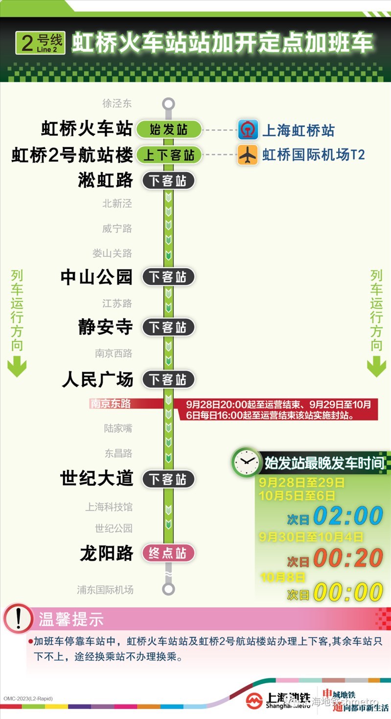 根據(jù)鐵路虹橋站夜間到達(dá)列車開行情況,9月28日、9月29日、10月5日、10月6日,鐵路在原夜間圖定計(jì)劃的基礎(chǔ)上增加了開行班次。為應(yīng)對(duì)鐵路臨時(shí)加開,做好虹橋火車站夜間列車集中到達(dá)大客流疏散工作,虹橋樞紐相關(guān)的地鐵2、10、17號(hào)線在既定延時(shí)或加開方案的基礎(chǔ)上進(jìn)一步增開定點(diǎn)加班車。其中,9月28日至29日、10月5日至6日夜間,虹橋火車站定點(diǎn)加班車最晚發(fā)車時(shí)刻為:2號(hào)線至次日2:00、10號(hào)線至次日0:30、17號(hào)線至次日0:00。同時(shí),9月30日至10月4日,2號(hào)線和10號(hào)線虹橋火車站定點(diǎn)加班車發(fā)車時(shí)刻推遲至次日0:20。