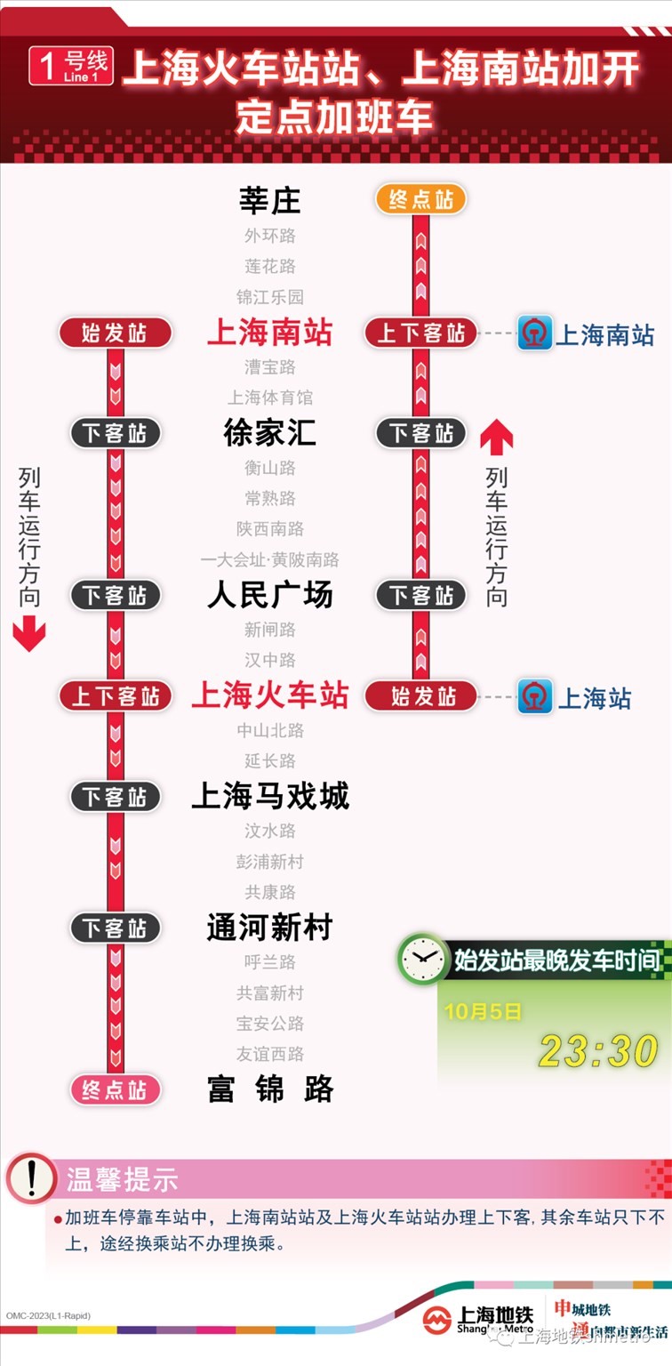 此外為做好節(jié)假日返程期間上?;疖囌尽⒑鐦蚧疖囌?、上海南站的夜間客流疏散工作,10月5日,地鐵1號(hào)線在圖定基礎(chǔ)上實(shí)施定點(diǎn)加開方案,加開末班車發(fā)車時(shí)間至23:30;另10月8日地鐵2號(hào)線增加定點(diǎn)加班車班次,加開末班車發(fā)車時(shí)間至次日0:00。