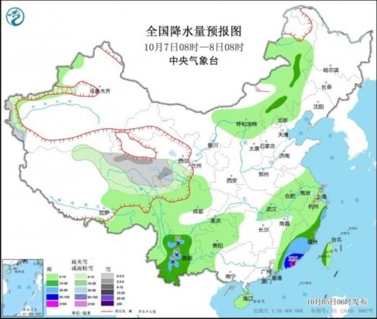10月7日08時(shí)至8日08時(shí),青海南部、西藏北部有小雪或雨夾雪,浙江東部、福建南部、云南中西部、廣東東部等地部分地區(qū)有大到暴雨,其中,廣東東部等地部分地區(qū)有大暴雨(100~220毫米)。內(nèi)蒙古中部、浙江北部、廣東中部等地部分地區(qū)有4~6級(jí)風(fēng)。東海西南部海域、臺(tái)灣海峽、南海東北部海域有7~9級(jí)風(fēng)、陣風(fēng)10~11級(jí),其中臺(tái)灣海峽部分海域風(fēng)力可達(dá)10~12級(jí)。