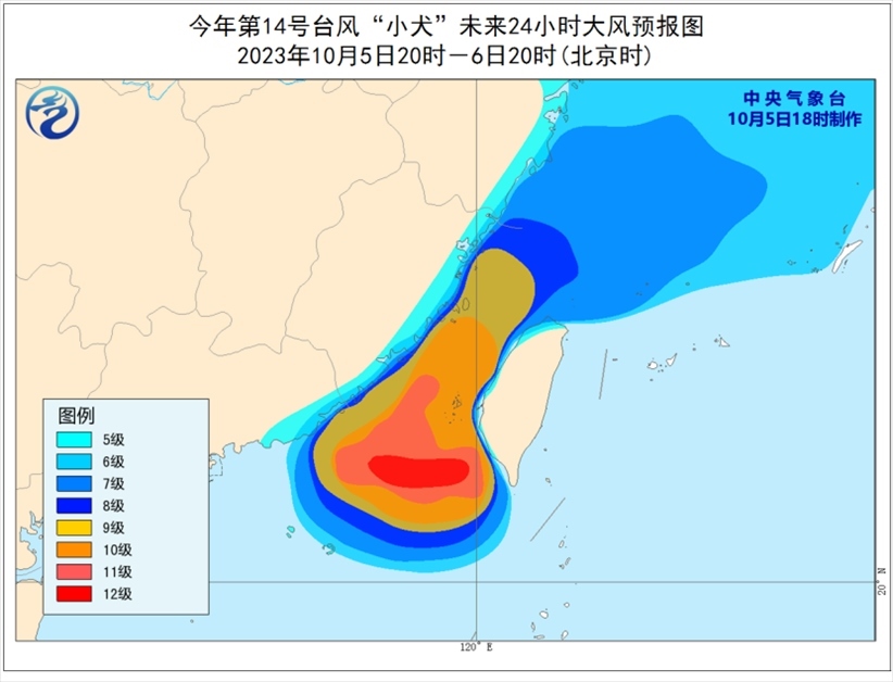 大風預報:5日20時至6日20時,東海大部及釣魚島附近海域、巴士海峽西北部、臺灣海峽、南海東北部以及浙江沿海、福建沿海、廣東東部沿海、臺灣島北部沿海將有6-8級、陣風9-10級的大風,其中巴士海峽西北部、臺灣海峽、南海東北部等地部分海域將有9-10級、陣風11-13級的大風,“小犬”中心經過的附近海面風力有11-13級,陣風14-15級。