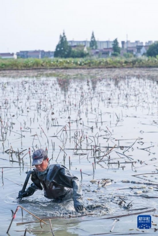 10月12日,東林鎮(zhèn)星火村的種植戶在采收蓮藕。