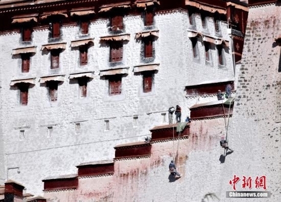 10月19日,西藏拉薩,工作人員對布達拉宮外墻噴灑涂料。每年秋冬交替時節(jié),布達拉宮外墻都要進行粉刷“美顏”。按照慣例,每季粉刷將在藏歷9月22日“神降節(jié)”前完成。
