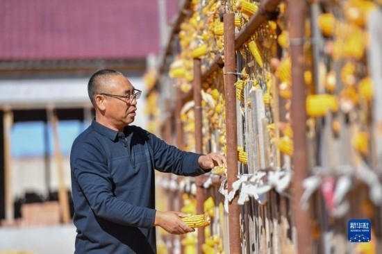 10月19日,在吉林省公主嶺市友忠種植農(nóng)民專業(yè)合作社,理事長孫友忠查看科學(xué)儲糧倉中的玉米儲存情況。