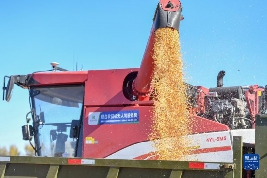10月19日,在中國科學(xué)院“黑土糧倉”科技會戰(zhàn)長春示范區(qū)公主嶺示范基地,無人駕駛農(nóng)機(jī)在收獲玉米。