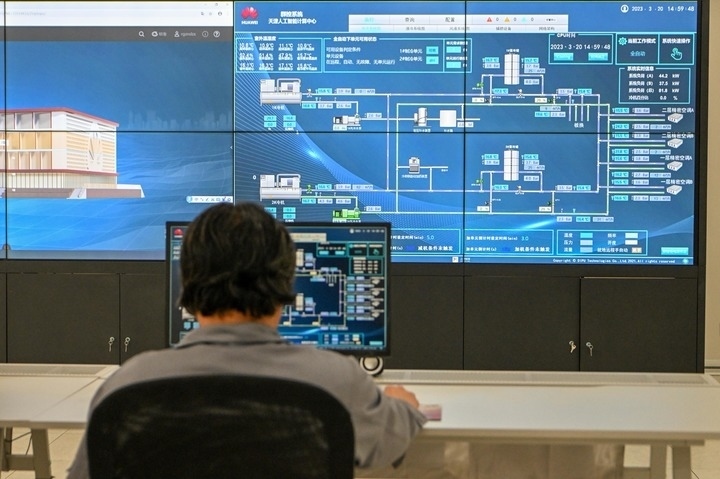 在天津市人工智能計算中心中控室,技術(shù)人員在監(jiān)控設(shè)備運(yùn)行情況。新華社記者 孫凡越 攝