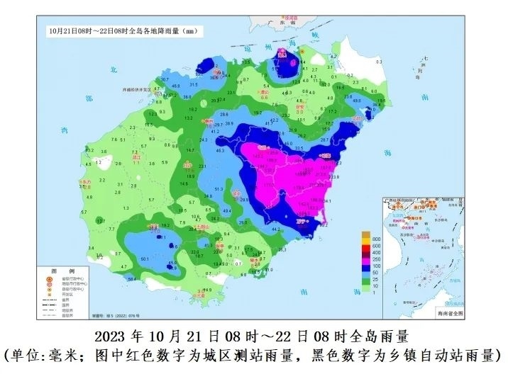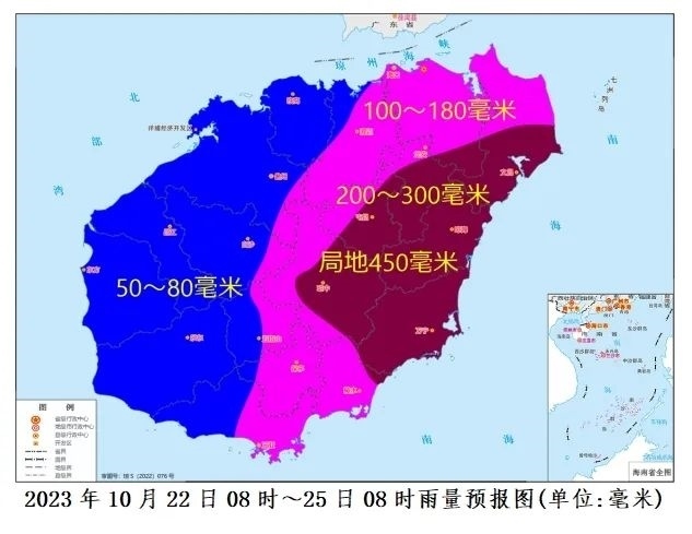 預(yù)計(jì),10月22日08時(shí)~25日08時(shí)各地累積雨量:文昌、瓊海、瓊中、屯昌和萬寧200~300毫米、局地450毫米,海口、澄邁、定安、保亭、陵水和三亞100~180毫米,其余市縣50~80毫米。