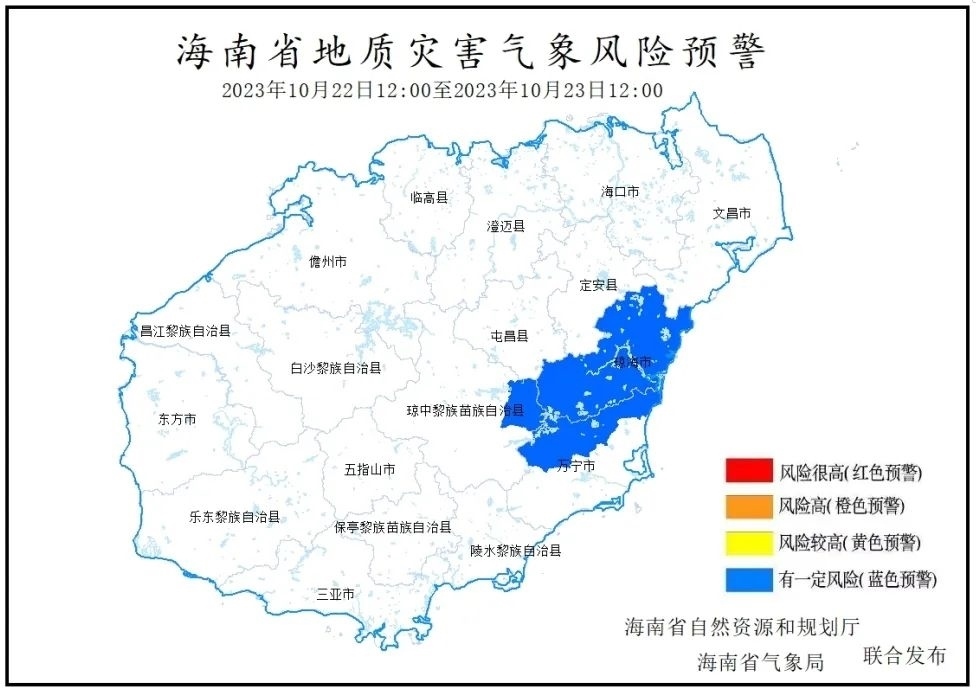 海南省自然資源和規(guī)劃廳、海南省氣象局2023年10月22日10時(shí)聯(lián)合發(fā)布地質(zhì)災(zāi)害氣象風(fēng)險(xiǎn)預(yù)警:根據(jù)海南省氣象臺前期降雨實(shí)況和未來24小時(shí)降雨預(yù)報(bào),預(yù)計(jì)未來24小時(shí)(2023年10月22日12:00-10月23日12:00)瓊海市全境,萬寧市龍滾鎮(zhèn)、三更羅鎮(zhèn)、北大鎮(zhèn),瓊中縣中平鎮(zhèn)降雨誘發(fā)地質(zhì)災(zāi)害有一定風(fēng)險(xiǎn),為Ⅳ級風(fēng)險(xiǎn)預(yù)警(藍(lán)色預(yù)警)。請上述市縣、鄉(xiāng)鎮(zhèn)政府及有關(guān)部門做好地質(zhì)災(zāi)害防御工作。
