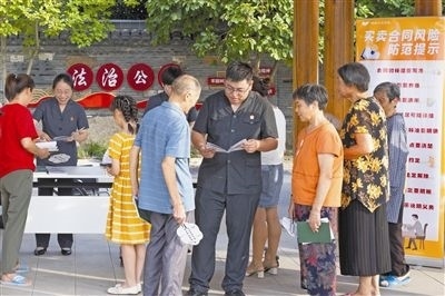 圖⑧:送法入村。圖為楓橋法庭通過(guò)設(shè)立“糾紛移動(dòng)普法站”,來(lái)到轄區(qū)各村鎮(zhèn)普法宣傳,送上普法小手冊(cè),提醒村民用好法律知識(shí),提前防范各類風(fēng)險(xiǎn)。