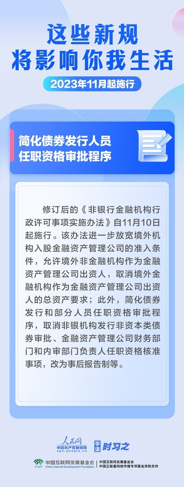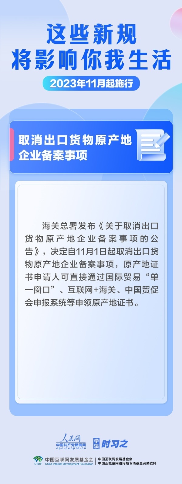 調(diào)整最高法知產(chǎn)法庭審理上訴案件范圍;簡化債券發(fā)行人員任職資格審批程序;取消出口貨物原產(chǎn)地企業(yè)備案事項……11月,這些新規(guī)施行,將影響你我生活。