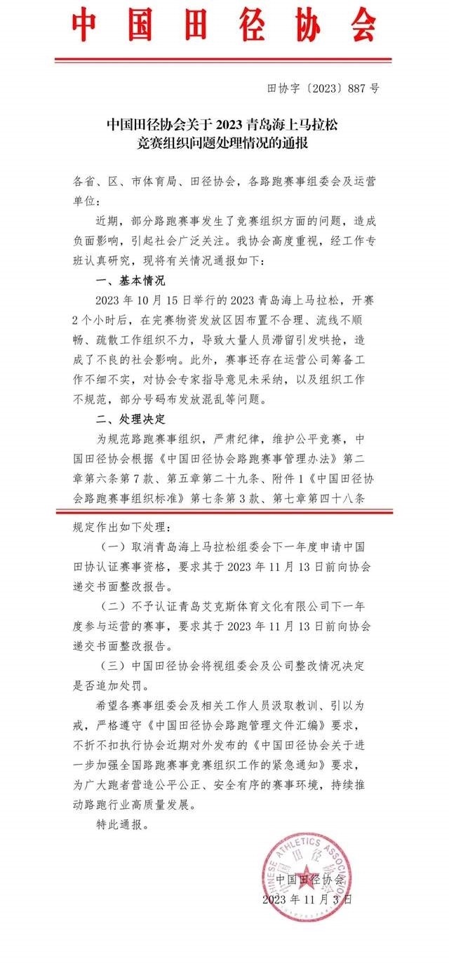 中國田協(xié)處罰大連、青島海上馬拉松組委會