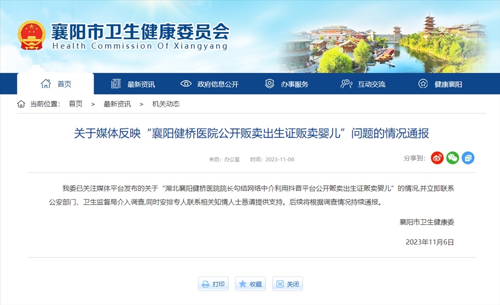·醫(yī)院院長被舉報涉嫌販賣出生證,襄陽衛(wèi)健委通報:聯(lián)系公安部門、衛(wèi)生監(jiān)督局介入調查,同時安排專人聯(lián)系相關知情人士懇請?zhí)峁┲С帧:罄m(xù)將根據調查情況持續(xù)通報。