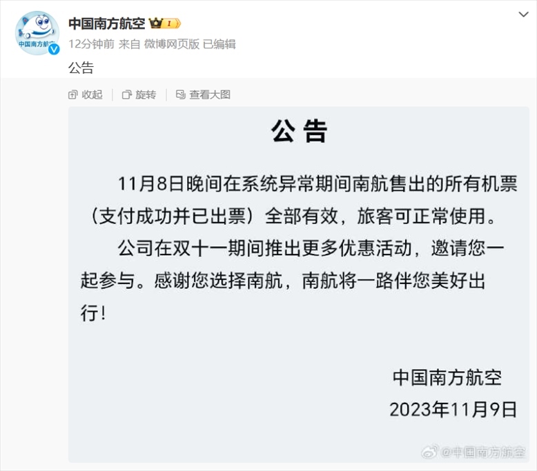 ·系統(tǒng)故障出現(xiàn)10元低價(jià)機(jī)票,南航回應(yīng):出票成功可正常出行。