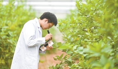 科研人員在潼南檸檬脫毒種苗繁育中心查看樹苗長勢。龍 帆攝
