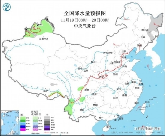 11月20日08時至21日08時,新疆沿天山地區(qū)和東部、內(nèi)蒙古西北部、西藏東部、甘肅河西、川西高原北部等地部分地區(qū)有小雪或雨夾雪,其中,新疆伊犁河谷和東部、西藏東北部等地部分地區(qū)有中到大雪(5~8毫米)。新疆北部、西藏東南部、四川盆地西部、臺灣島東部等地部分地區(qū)有小雨。內(nèi)蒙古河套地區(qū)、甘肅河西、遼寧東部、新疆北部等地部分地區(qū)有4~6級風(見圖3)。